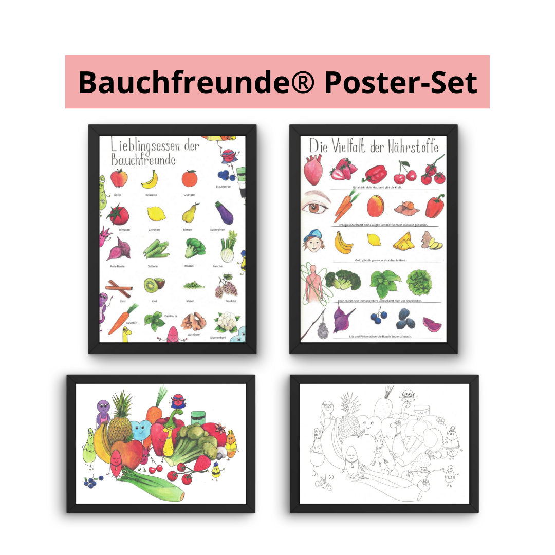 Mit dem Bauchfreunde Poster-Set holst du die Bauchfreunde© direkt in euren Alltag. Ob am Kühlschrank, über dem Esstisch oder im Kinderzimmer: Die Poster erinnern dein Kind spielerisch daran, wie buntes Essen den Bauch stärkt – ganz ohne Druck und ohne Diskussionen.