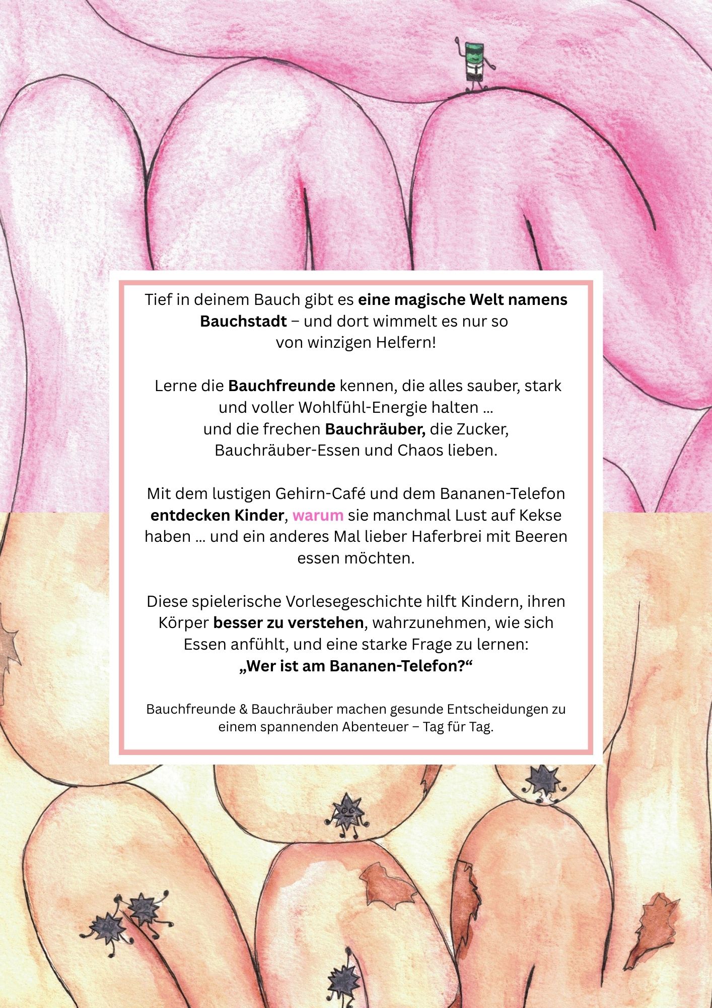 Mit dem Gehirn-Café und dem Bananen-Telefon (Vagusnerv) lernen Kinder im Alter von 3–9Jahren, wie im Bauch Essen „bestellt“ wird: Mal sind die Bauchfreunde am Telefon und wünschen sich Gemüse, Obst, Hafer & Joghurt – und mal übernehmen die frechen Bauchräuber und rufen nach Zucker, Keksen & Bauchräuber-Essen. So verstehen Kinder kindgerecht Zuckerlust, Heißhunger und wie sich ihr Körper nach verschiedenen Lebensmitteln anfühlt.